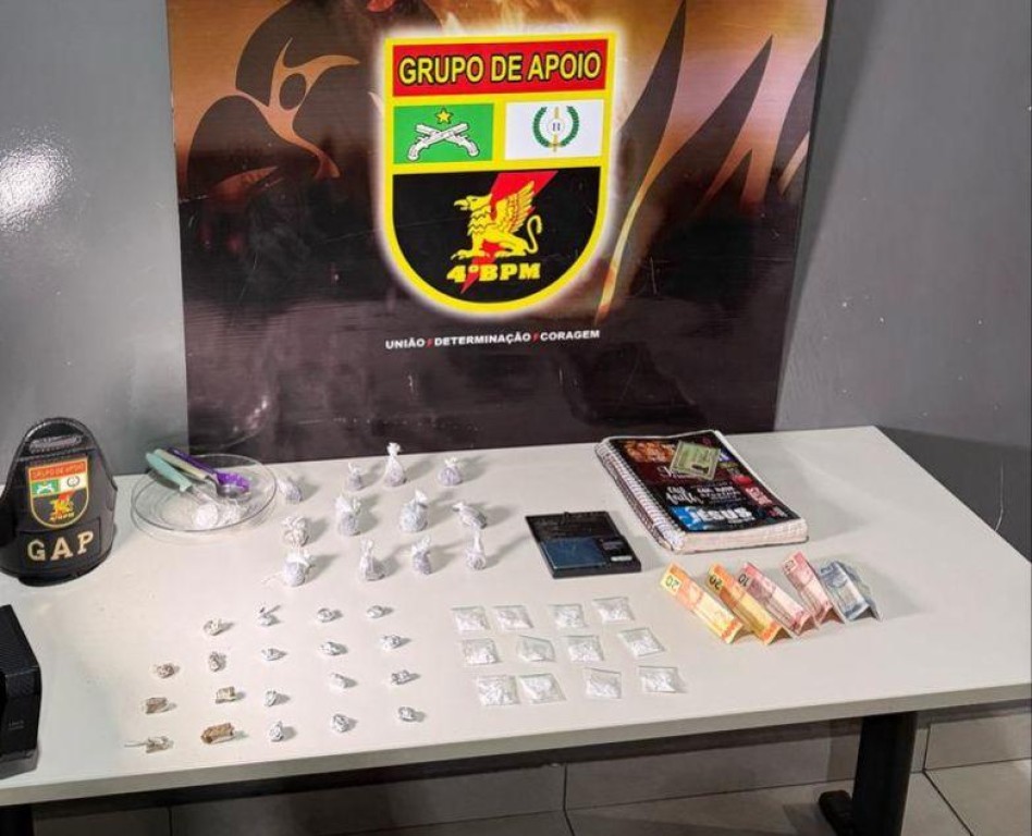 No interior da casa, os militares encontraram 61 porções de maconha e 10 pedras de pasta base de cocaína, além de uma balança de precisão e equipamentos para o tráfico. O suspeito foi conduzido para a Central de Flagrantes para registro da ocorrência e entregue à Polícia Judiciária Civil.