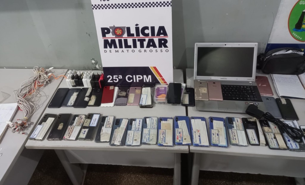 Policiais militares da 25ª Companhia Independente apreenderam, nesta quinta-feira (18.05), 36 aparelhos celulares, 290 chips (entre novos e usados), uma motocicleta e um veículo no bairro José Carlos Guimarães, em Várzea Grande.