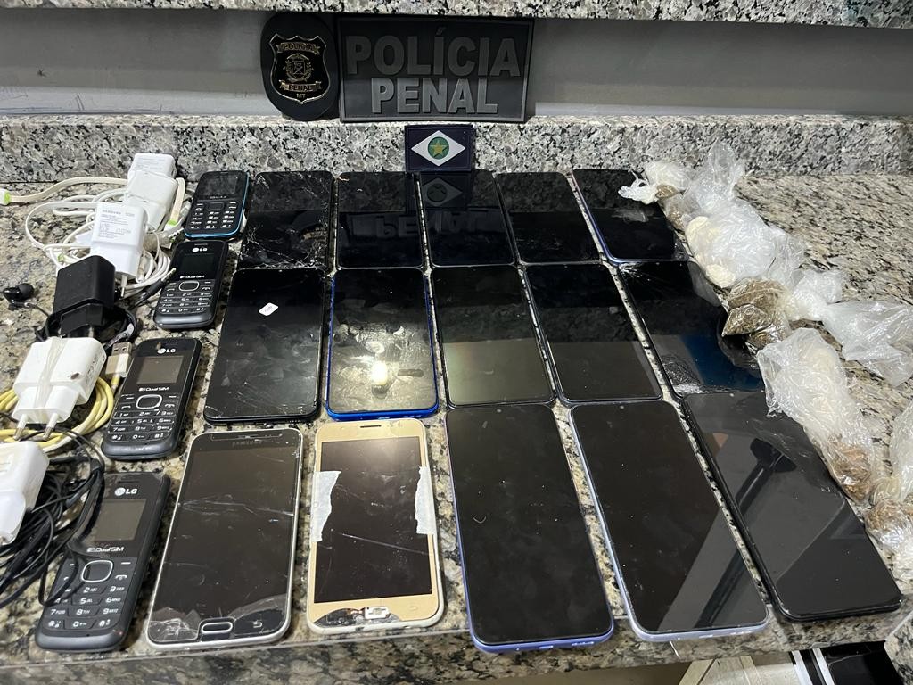 Ao todo, os policiais penais apreenderam 19 aparelhos celulares, 15 deles smartphones, 4 carregadores, 4 fones de ouvidos, e 19 porções de entorpecentes, entre maconha e pasta base de cocaína.