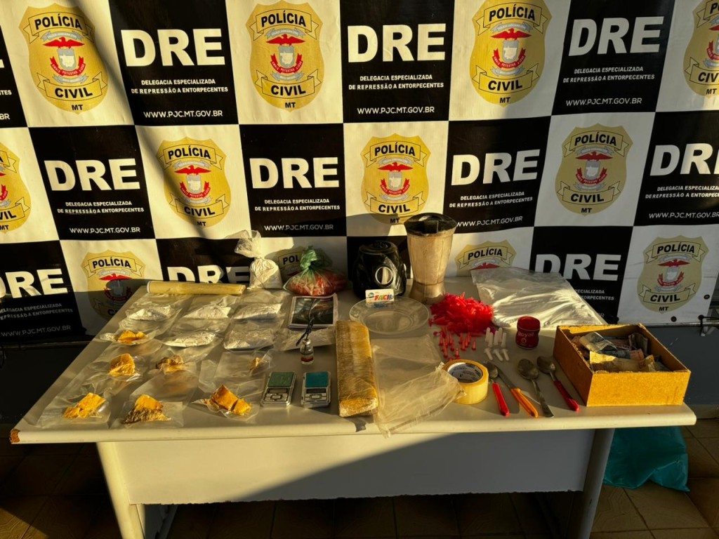 No interior da casa foram encontradas uma mochila com diversos materiais e porções de pasta base de cocaína, cocaína, comprimidos de ecstasy, maconha, balança de precisão e um liquidificador, além de anotações do comércio de drogas.