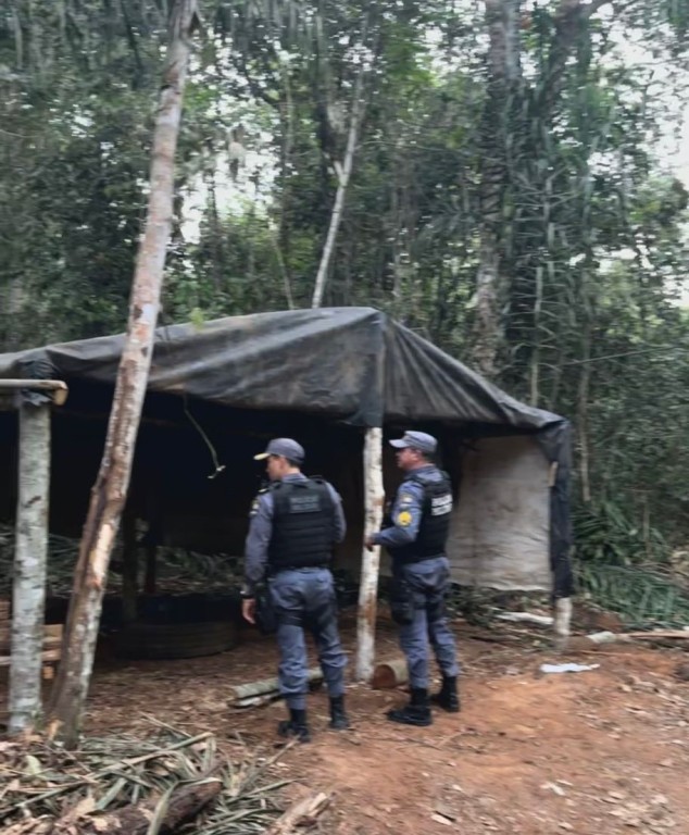Os policiais constataram, entre outros possíveis crimes, o desmatamento de uma trilha de cerca de 3 km para chegar até a margem de um córrego, ponto onde ocorria a retirada ilegal de madeira e a instalação de moradias improvisadas.