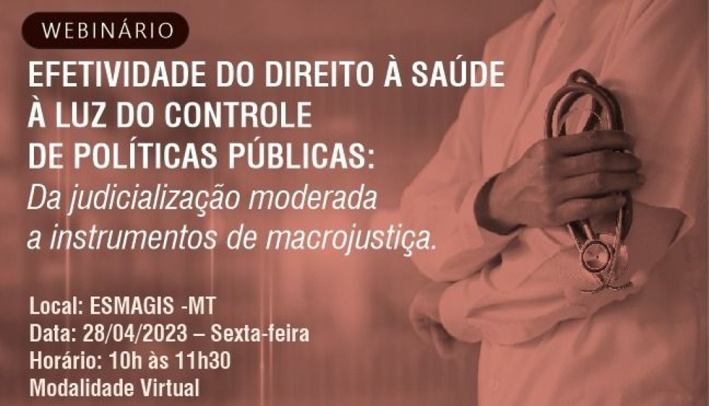 A Escola Superior da Magistratura de Mato Grosso (Esmagis-MT) https://esmagis.tjmt.jus.br/ promove, no dia 28 de abril, o webinário “Efetividade do Direito à saúde à luz do controle de políticas públicas: da judicialização moderada a instrumentos de macrojustiça”.