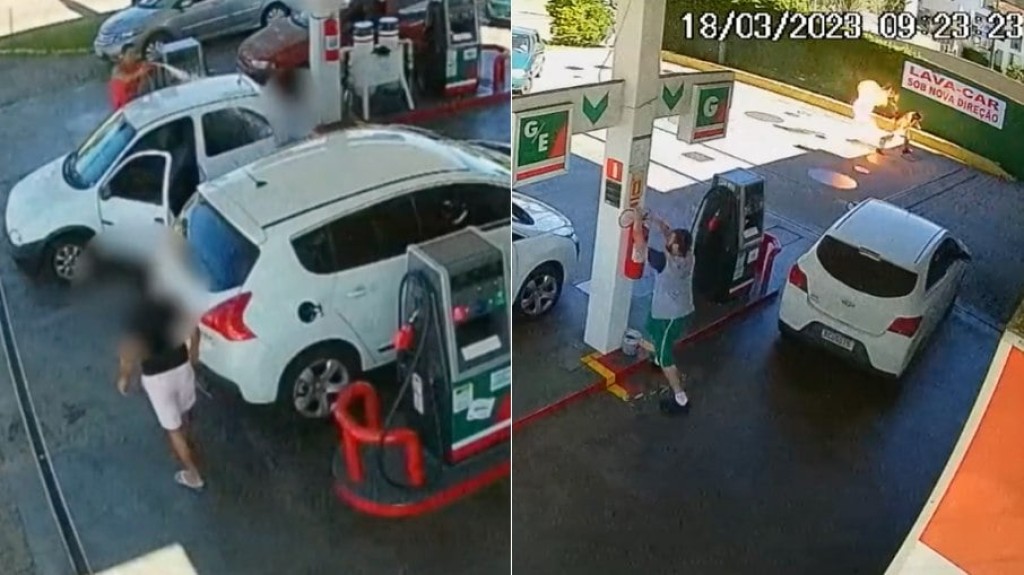 Em seguida, como mostra o vídeo, é possível ver o frentista apontando a mangueira de combustível na direção do cliente. Depois, ele corre atrás de Caio com um isqueiro para atear fogo nele.