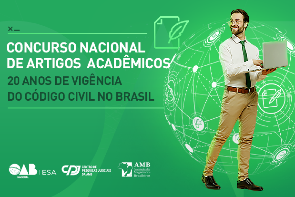 Esta matéria possui recursos de texto alternativo para promover a inclusão das pessoas com deficiência visual. Descrição da imagem: Peça publicitária colorida com homem vestido de camisa branca, gravata verde e calça marrom. Ele segura notebook nas mãos. Texto: “Concurso nacional de artigos acadêmicos – 20 anos de vigência do Código Civil no Brasil”. Arte contém os da OAB/ESA, Centro de Pesquisas Judiciais da AMB e da AMB.