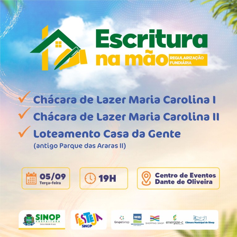 O prefeito Roberto Dorner entregará amanhã, terça-feira (05), aproximadamente 200 escrituras aos moradores das Chácaras de Lazer Maria Carolina I e II e do Loteamento Casa da Gente (antigo Parque das Araras II). A entrega, que fará parte da programação do Festeja Sinop, em comemoração aos 49 anos do município, será a partir das 19h, no Centro de Eventos Dante de Oliveira.