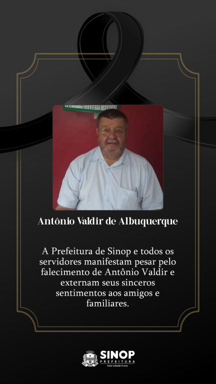 A Prefeitura Municipal de Sinop e o prefeito Roberto Dorner lamentam, com pesar, o falecimento de Antônio Valdir de Albuquerque, de 72 anos, na manhã de hoje. Antônio atuava como corretor de imóveis e era pioneiro do município. Chegou em Sinop no ano de 1973, vindo do Estado do Paraná. Ele deixa esposa, três filhas e dois netos.