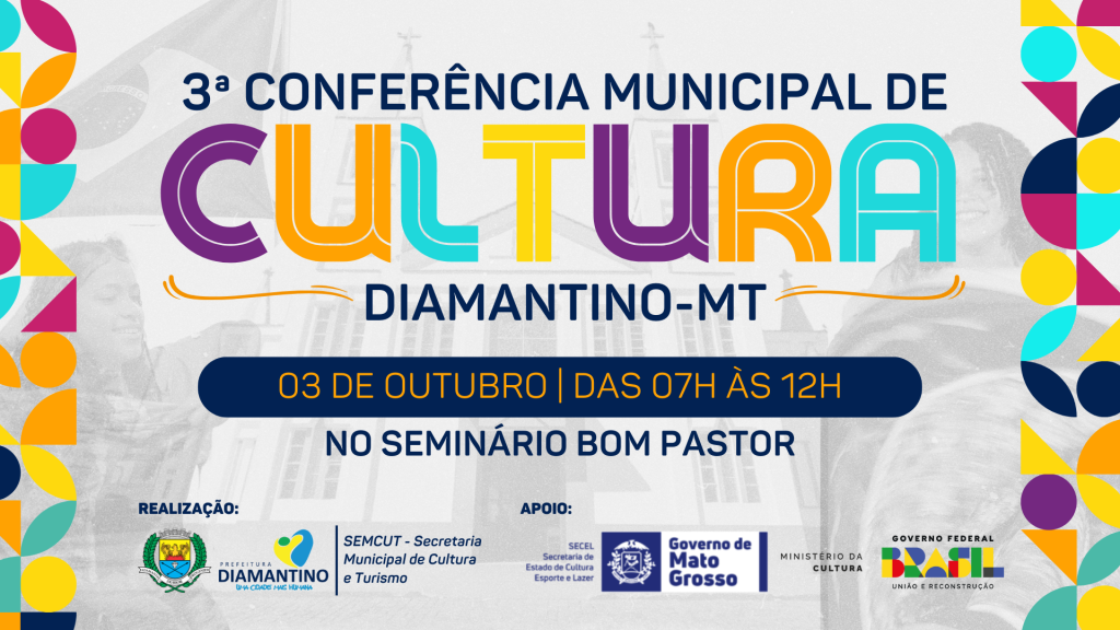No dia 03 de Outubro, das 07h às 12h, a Prefeitura Municipal, por meio da Secretaria de Cultura e Turismo, realiza a 3ª Conferência Municipal de Cultura de Diamantino no Seminário Bom Pastor. Compondo a 9ª região do Polo Centro-Oeste, Diamantino e representantes de cidades vizinhas participarão do encontro gratuito previsto pelo Ministério da Cultura.