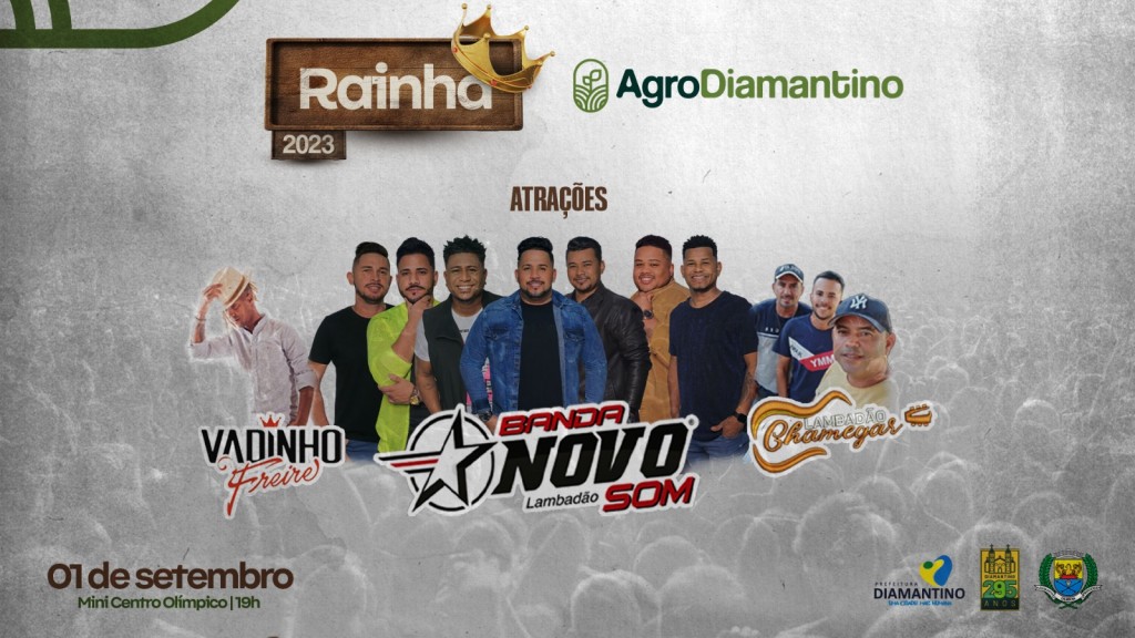A Prefeitura de Diamantino, por meio da Secretaria Municipal de Cultura e Turismo, anunciou hoje (31.08), a programação completa de shows locais, regionais e um show nacional para a grande escolha da Rainha AgroDiamantino 2023. Entre os nomes confirmados estão: Vadinho Freire, Banda Novo Som e Lambadão Chamegar. O evento, que conta com 12 candidatas ao título, é realizado em parceria com a secretaria municipal de Assistência Social, Trabalho e Cidadania.