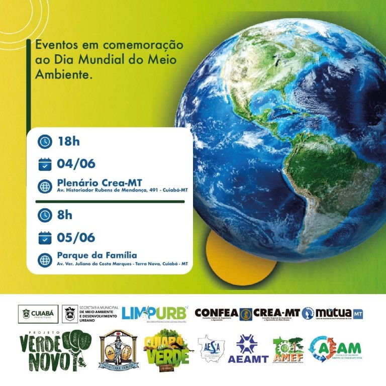 A Prefeitura de Cuiabá, por meio da Secretaria Municipal de Meio Ambiente e Desenvolvimento Sustentável, convida a população para participar da programação da Semana do Meio Ambiente, que será aberta na próxima terça-feira (04), com uma palestra técnica ministrada pelo Conselho Regional de Engenharia e Agronomia do Mato Grosso (Crea-MT), a partir das 18 horas, no plenário da autarquia. Os interessados precisam registrar a inscrição por meio do link https://forms.gle/LnibYMU4Ne6KXW6m7 para garantir a participação.