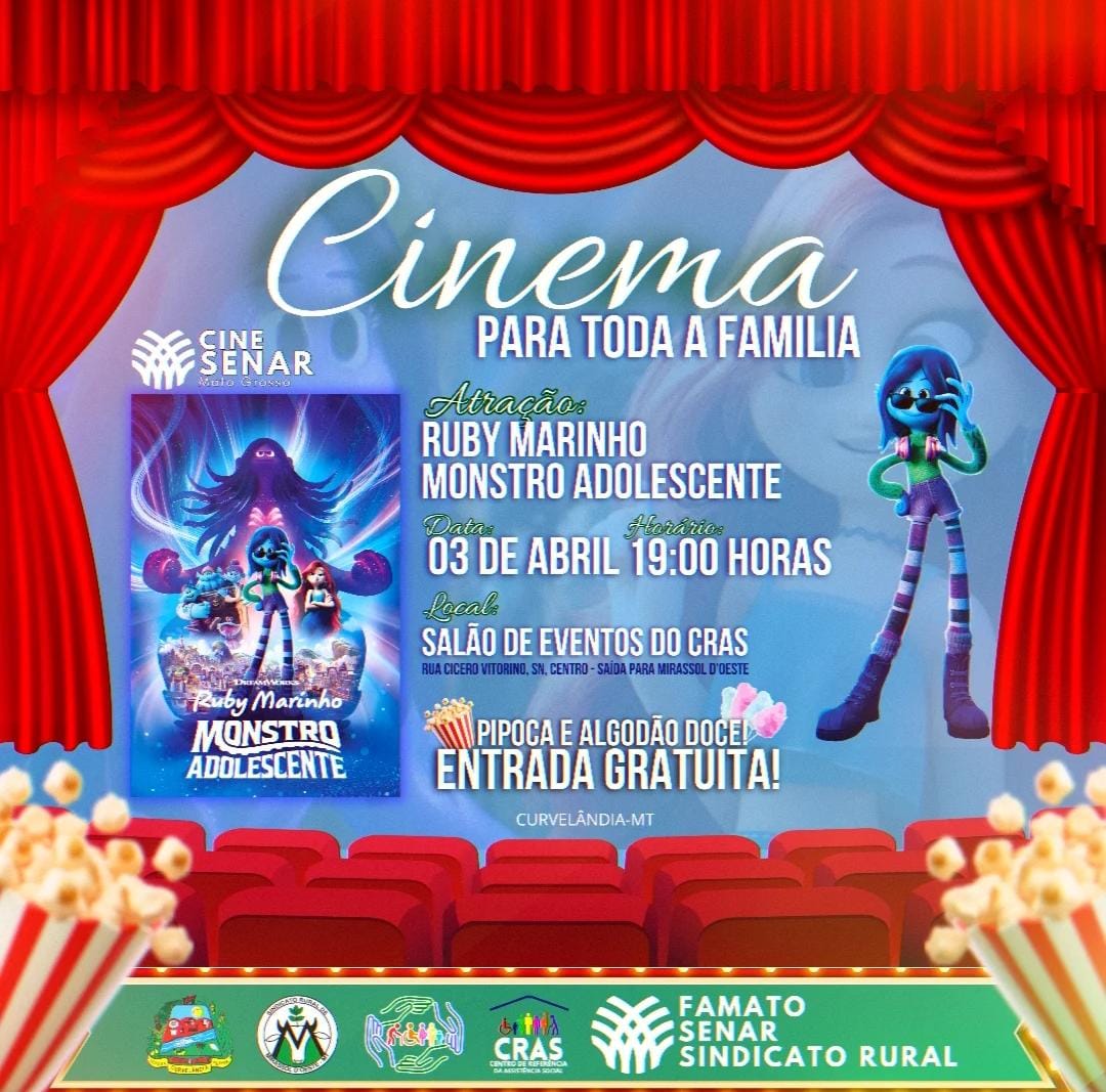 A Prefeitura Municipal de Curvelândia, em parceria com o Senar, convida a população para um evento especial de lazer e cultura: o Cine Senar – Cinema Para Toda a Família. O evento será realizado no dia 03 de abril, com início às 19h, no salão de eventos do CRAS (Centro de Referência de Assistência Social).