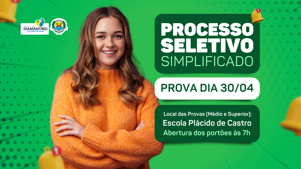 A Prefeitura Municipal de Diamantino informa que as provas objetivas para os cargos de nível médio e superior do Processo Seletivo Simplificado Nº 003/2023 serão realizadas no dia 30/04/2023 com abertura dos portões às 07h e início das provas às 08h na Escola Estadual Plácido de Castro, localizado na Av. Municipal, nº 879, Centro.