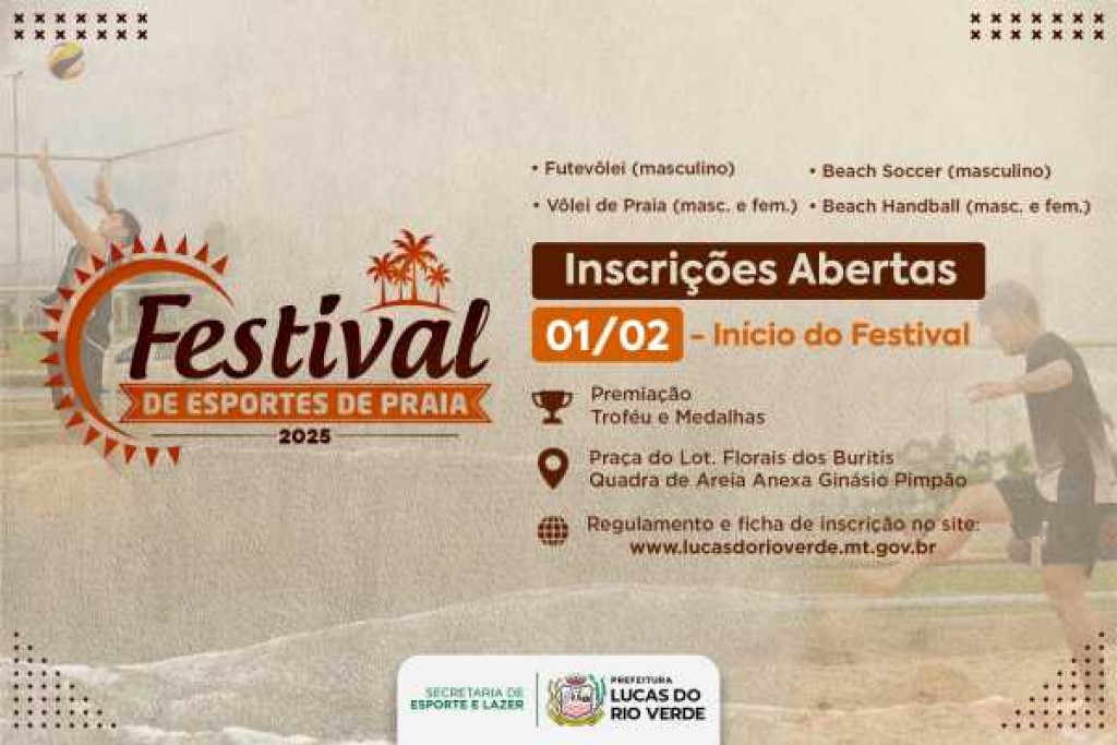 A Prefeitura de Lucas do Rio Verde, por meio da Secretaria de Esporte e Lazer, abriu nesta quinta-feira (16) as inscrições para o Festival de Esportes de Praia. O evento será disputado nas modalidades de Futevôlei, Vôlei de Praia, Beach Soccer e Beach Handball.