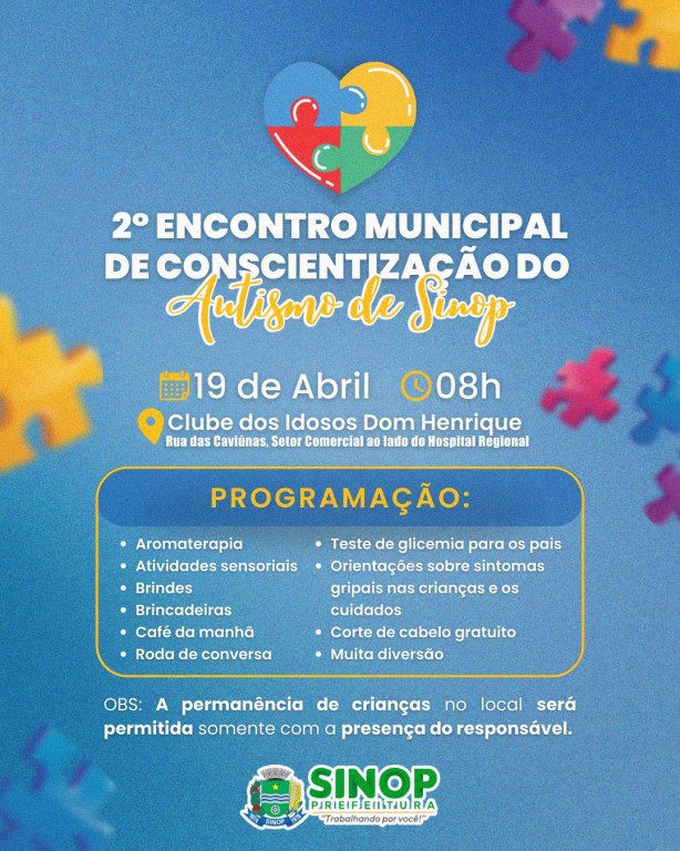 A prefeitura de Sinop, por meio da Secretaria de Saúde, realizará nesta quarta-feira (19), o 2° Encontro Municipal de Conscientização do Autismo. O evento vai reunir pais, responsáveis, crianças e representantes da sociedade em geral, para discutir, orientar e conscientizar sobre o Abril Azul.
