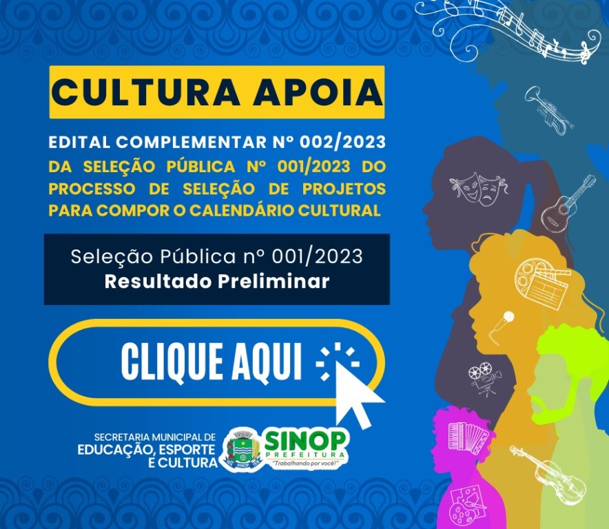 A Prefeitura de Sinop, por meio do departamento de cultura, informa que já está disponível o edital complementar nº 002/2023, com o resultado preliminar do “Cultura Apoia”, processo de seleção de projetos para compor o calendário cultural do município.