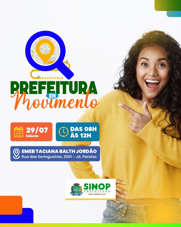E neste sábado (29) tem mais uma edição do projeto “Prefeitura em Movimento”, das 8h às 12h no Bairro Jardim Paraíso, na Escola Municipal de Educação Básica Taciana Balth Jordão. A ação reúne em um só lugar vários serviços para os moradores do bairro e também para toda a comunidade que está convidada para participar.