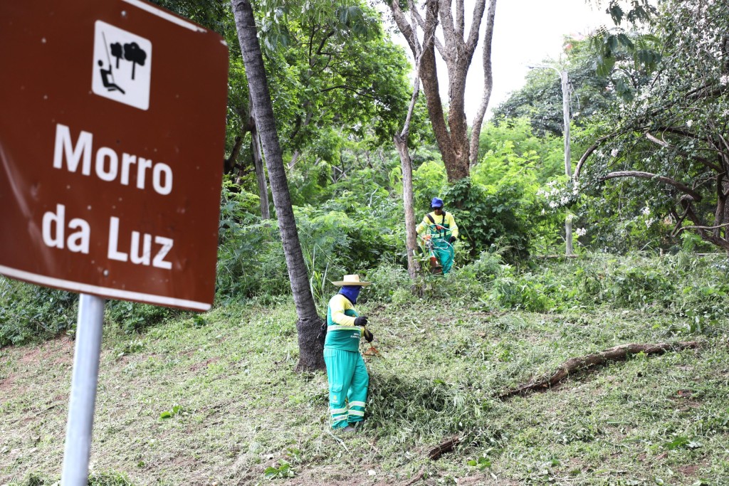 Na imagem, profissionais da Limpurb realizam a capinagem da vegetação no Morro da Luz. No canto esquerdo, uma placa marrom sinaliza que o local é um ponto turístico de Cuiabá.