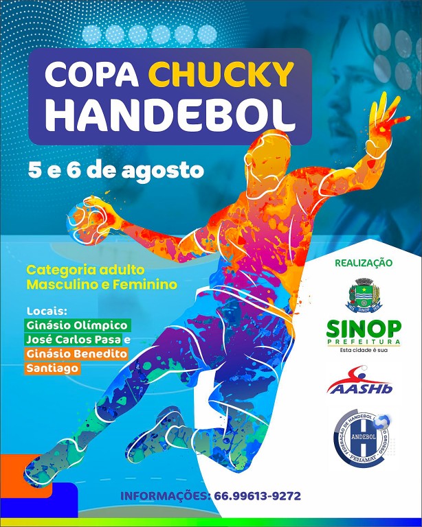 A Prefeitura de Sinop realiza, neste final de semana, a 2ª Copa Chucky de handebol, na categoria masculino e feminino adulto. As disputas serão realizadas nos ginásios José Carlos Pasa e Benedito Santiago e começam amanhã (05), às 9h. A entrada é gratuita.