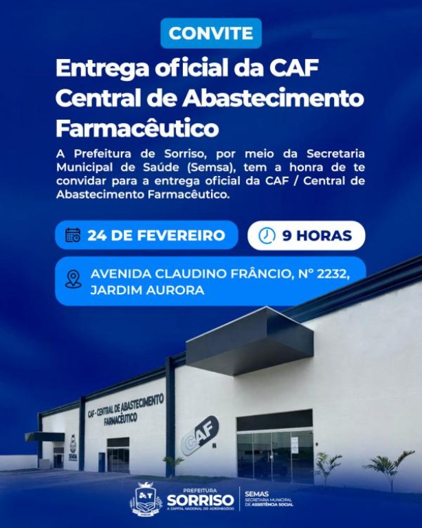 A Prefeitura de Sorriso, por meio da Secretaria Municipal de Saúde (Semsa), promove nesta terça-feira (24), às 9 horas, a entrega oficial da CAF – Central de Abastecimento Farmacêutico, localizada na Avenida Claudino Frâncio, nº 2232, no bairro Jardim Aurora.