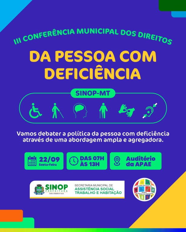 Prefeitura realiza III Conferência Municipal dos Direitos da Pessoa com Deficiência nesta sexta-feira (22) Com objetivo de debater os principais desafios e decidir prioridades para as políticas públicas relacionadas às pessoas com deficiência residentes no município, a Prefeitura de Sinop, por meio da Secretaria de Assistência Social, Trabalho e Habitação realiza, nesta sexta-feira (22), a III Conferência Municipal dos Direitos da pessoa com deficiência. O encontro será no auditório da Associação de Pais e Amigos dos Excepcionais (APAE), das 7h às 13h.