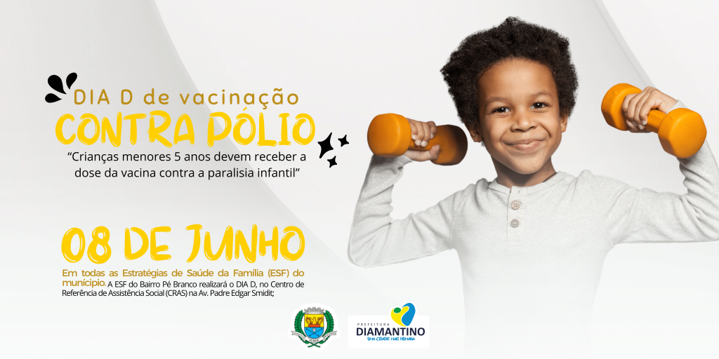 A Prefeitura de Diamantino, por meio da Secretaria de Saúde, realizará no sábado, dia 08 de junho, o “Dia D” de vacinação da Campanha Nacional Contra Poliomielite. Os atendimentos ocorrem em todas as Estratégias de Saúde da Família (ESF) do município, das 08h às 16h.