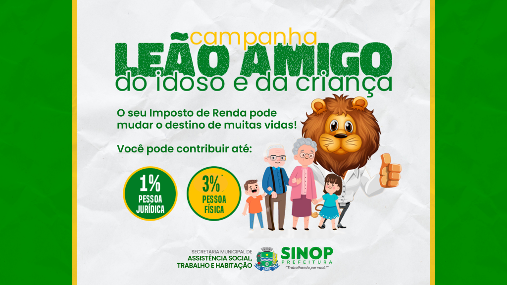 A campanha “Leão amigo do Idoso e da Criança”, que incentiva a arrecadação do Imposto de Renda para os Fundos Municipais da Infância e Adolescência (FIA) e do Idoso (FDI) continua até o mês de maio, quando se encerra o período de declaração do Imposto de Renda. A ação foi lançada no último dia 14 e desde então os representantes da rede de proteção dos direitos da criança e do idoso estão visitando empresas e pontos estratégicos do município, para conscientizar sobre a campanha e incentivar a destinação de parte do imposto para os Fundos Municipais. A estimativa é superar a arrecadação de 2022, em que Sinop ultrapassou os R$1,2 milhão em captação para o FIA e R$844 mil para o FDI.