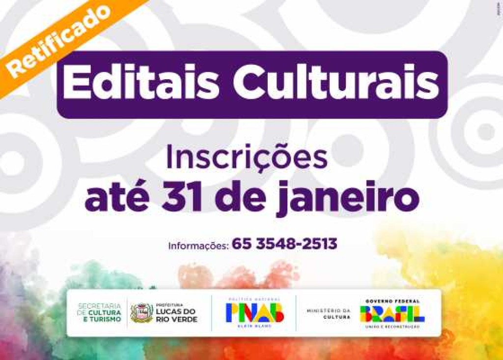 A Prefeitura de Lucas do Rio Verde, por meio da Secretaria de Cultura e Turismo, publicou nesta sexta-feira (31), a retificação nº 01 dos Editais 009/2024 de Bolsas Culturais e 010/2024 de Premiação de Agentes Culturais. As inscrições permanecem abertas até às 23h59 de hoje.