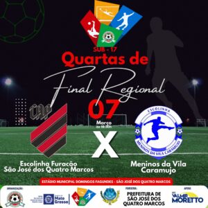 A partir das 18:30 horas, o Sub-17 entra em campo com o duelo entre a Escolinha Furacão de Quatro Marcos e os Meninos da Vila do Distrito Caramujo. Um confronto que envolve jovens talentos e que certamente proporcionará muita emoção aos torcedores presentes.