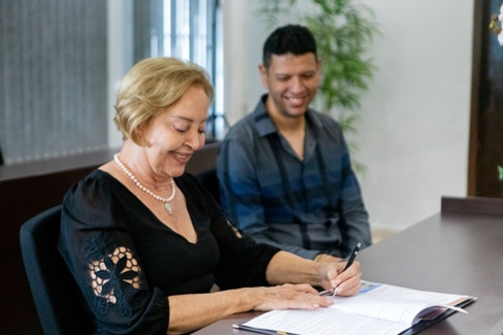 #Paratodosverem. Esta matéria possui recursos de texto alternativos para promover a inclusão de pessoas com deficiência visual. FOTO 1: A imagem mostra em primeiro plano a desembargadora Clarice Claudino sentada, assinando o contrato. Ela é uma mulher branca, de cabelos loiros, lisos e curtos. Está usando vestido preto e colar de pérolas. Ao lado dela está o proprietário da empresa de construção, um homem jovem, moreno, de cabelos curtos e escuros. Ele veste camisa de manga comprida, azul escuro com listras pretas. Os dois estão sorrindo. Foto 2: A imagem mostra cinco pessoas em pé, sorrindo para a câmera. A primeira, da esquerda para a direita, é a juíza Maria Lucia Prati. Ela é uma mulher branca, cabelos loiros na altura dos ombros e usa vestido preto. Ao lado, está o proprietário da empresa de construção. Em seguida está a desembargadora Clarice mostrando a ordem de serviço. Ao seu lado está a juíza Caroline Schneider. Ela é uma mulher branca, loira de cabelos compridos. Ela veste calça e blazer rosa pink e blusa preta. Ao seu lado está o juiz André Simões. Ele é um homem branco, de cabelos curtos e escuros e veste um terno azul marinho, com camisa azul claro e gravata vermelha.