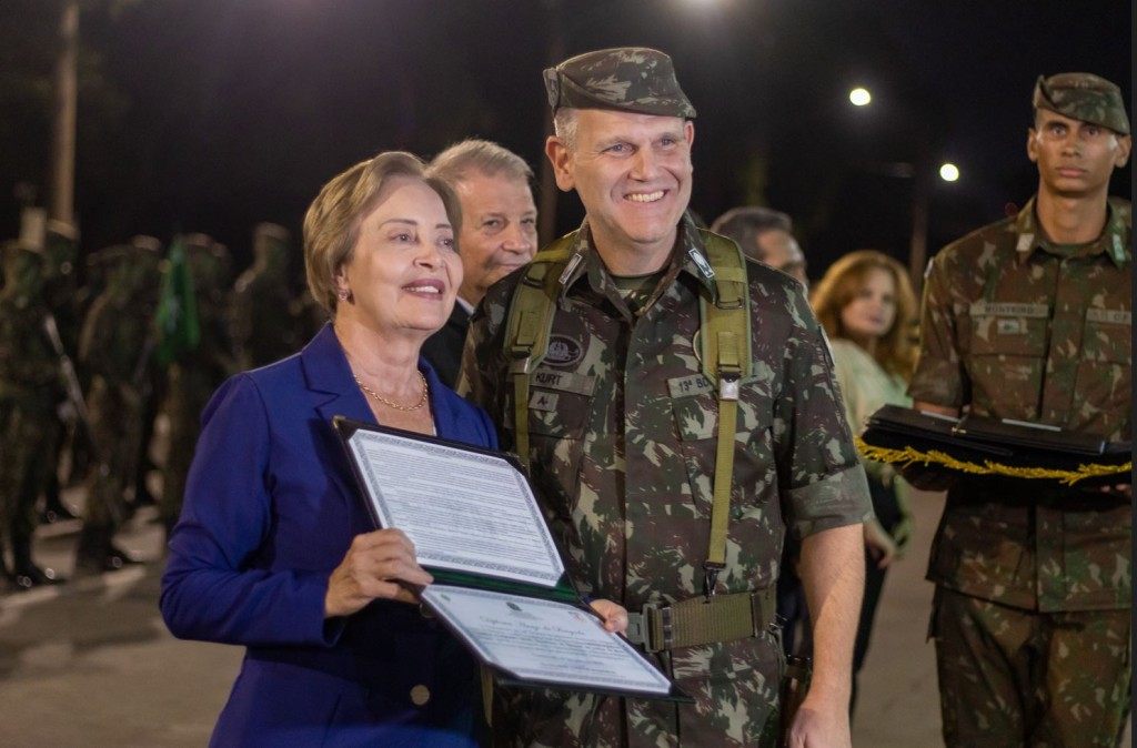 #Paratodosverem. Esta matéria possui recursos de texto alternativo para promover a inclusão das pessoas com deficiência visual. Foto1: Presidente Clarice Claudino ao lado do General Kurt, os dois sorriem para foto. A presidente está com uma pasta na mão com seu diploma. Ao fundo, militares estão em formação. Foto 2: Presidente Clarice Claudino está centralizada no quadro, ela olha e sorri levemente. Em suas mãos, Clarice segura o diploma Amigo da Brigada. Ao fundo, militares estão em formação. Foto 3: Em primeiro plano desfocado, um soldado em posição de continência, em segundo plano e com foco, presidente Clarice ao lado do General Kurt. Ambos estão em pé, em posição de sentido e olham os soldados a frente.