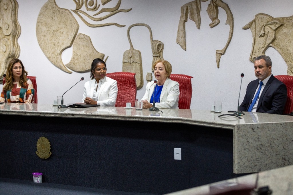#paratodosverem. Esta matéria possui recursos de texto alternativo para promover a inclusão das pessoas com deficiência visual. Descrição da imagem 1: Foto colorida na horizontal, mostra autoridades na mesa do pleno. A presidente do TJMT, desembargadora Clarice Claudino da Silva, mulher branca, cabelos loiros curtos, usa uma blusa azul e um terno branco. Sentada ao seu lado, a presidente do Tribunal Regional do Trabalho de Mato Grosso, Adenir Carruesco. Uma mulher de pele negra, cabelos pretos, usa uma blusa e terno branco. A diretora da Escola Judicial do Tribunal Regional do Trabalho, desembargadora Eleonora Lacerda, uma mulher branca, cabelos claros compridos, usa uma blusa estampada. E por fim, o juiz e coordenador pedagógico da Esmagis, Antônio Veloso Peleja Júnior, um homem de pele negra, cabelos e barbas grisalhas, usa camisa branca, gravata azul e terno preto.