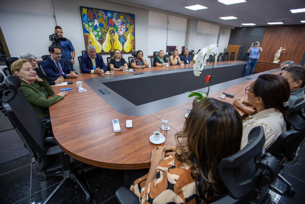 Primeira imagem: Presidente do TJMT, desembargadora Clarice Claudino da Silva, em destaque na foto, conversando com integrantes do SINJUSMAT. Ela está sentada atrás de uma grande mesa em formato de ‘U’.