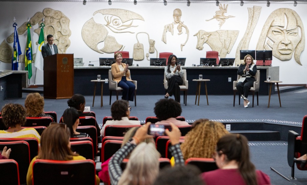 Primeira imagem: foto horizontal colorida do plenário do TRT, onde estão sentadas as desembargadoras Clarice e Adenir e a advogada Manoela em poltronas cinzas ao centro e a plateia está sentada de frente em poltronas vermelhas. Ao fundo, há cadeiras e computadores do Pleno e esculturas de mármore de elementos indígenas e da natureza.