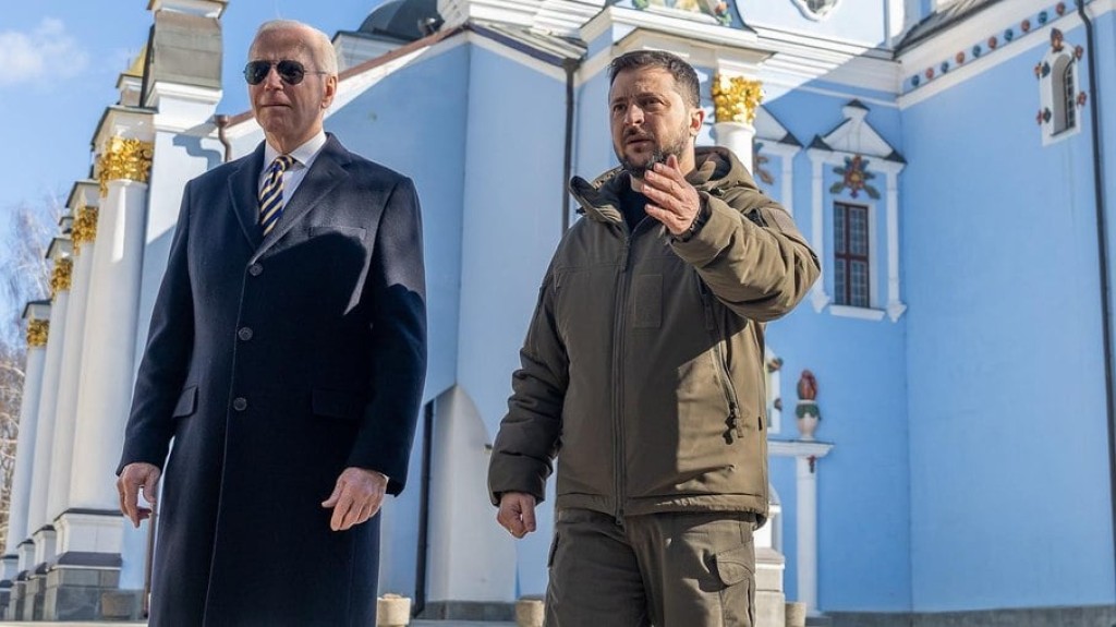 O presidente Joe Biden fez uma visita surpresa a Kiev , capital da Ucrânia, nesta segunda-feira (20). O político norte-americano se encontrou com o presidente Volodymyr Zelensky e a primeira-dama Olena Zelenska. Realizado no palácio presidencial, o encontro serviu para reforçar o auxílio norte-americano, uma vez que a cidade ainda sofre com ataques russos.