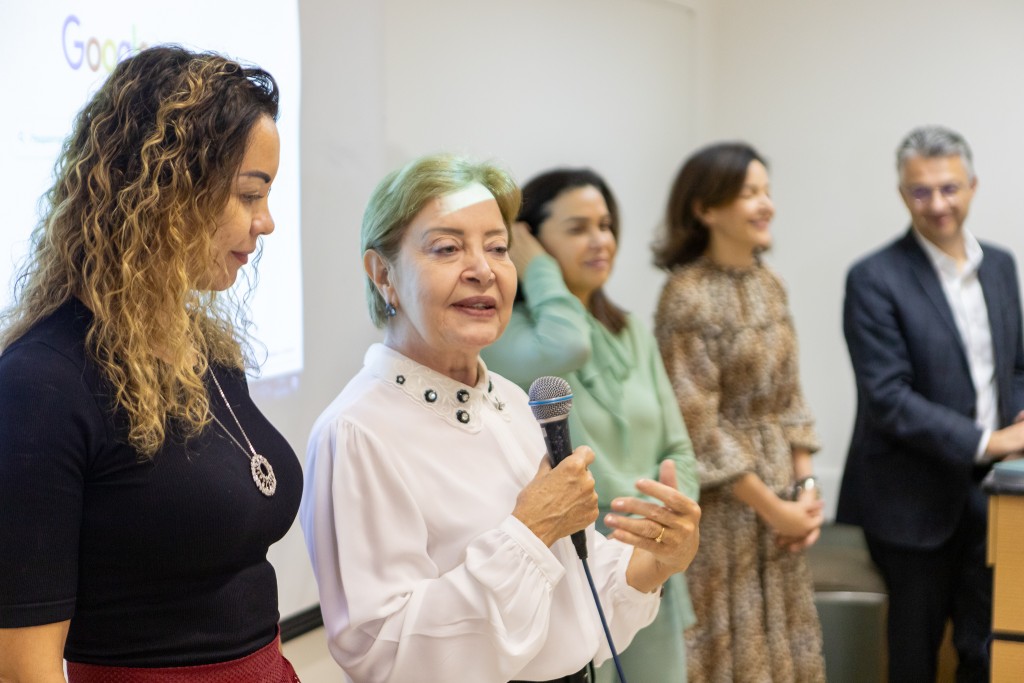#Paratodosverem. Esta matéria possui recursos de texto alternativo para promover a inclusão das pessoas com deficiência visual. Foto 1: Desembargadora Clarice Claudino discursa para os participantes do evento. Ela é uma senhora branca, de cabelos loiros, lisos e curtos, está usando uma camisa de manga comprida branca com e está segurando o microfone e gesticulando. Do lado esquerdo da foto, está a juíza Cristiane Padim, uma mulher branca, de cabelos loiros, cacheados e compridos, usando blusa preta, saia vermelha e colar prateado. Do outro lado da desembargadora, as organizadoras e o palestrante do evento. Foto 2: Palestrante Francisco Satiro fala ao microfone na frente de uma sala cheia de alunos. Na primeira fila estão a desembargadora Clarice Claudino e a juíza Cristiane Padim. Foto 3: Presidente do Converge Emrpesarial, Nalian Borges, concede entrevista à Tv.Jus. Ela é uma mulher de pele morena clara, olhos castanhos claros, cabelo liso, castanho e médio, usa blusa verde com laço no pescoço.