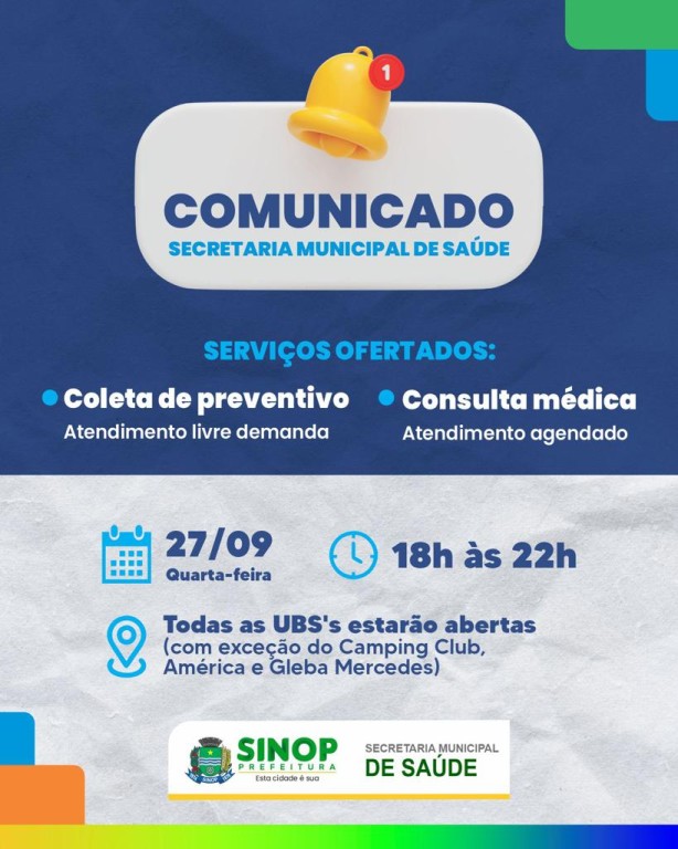 A Prefeitura de Sinop, por meio da Secretaria de Saúde (SMS), realizará nesta quarta-feira (27) uma ação com horário estendido nas Unidades Básicas de Saúde (UBS). Das 18h às 22h, os serviços incluirão coleta de preventivo (papanicolau) sem necessidade de agendamento, bem como consultas médicas com agendamento prévio.