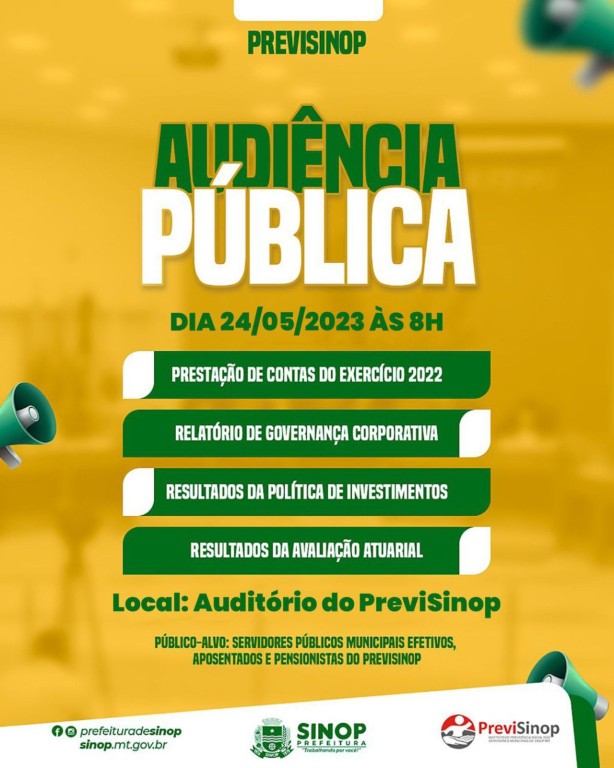 Servidores ativos, aposentados e pensionistas, são convidados a participar da Audiência Pública do Instituto de Previdência Social dos Servidores Municipais de Sinop (PreviSinop), que será realizada nesta quarta-feira (24), às 8h. Em pauta serão abordados os seguintes assuntos: Prestação de Contas do exercício 2022; Relatório de Governança Corporativa; Resultados da Política de investimentos; Resultados da Avaliação Atuarial.