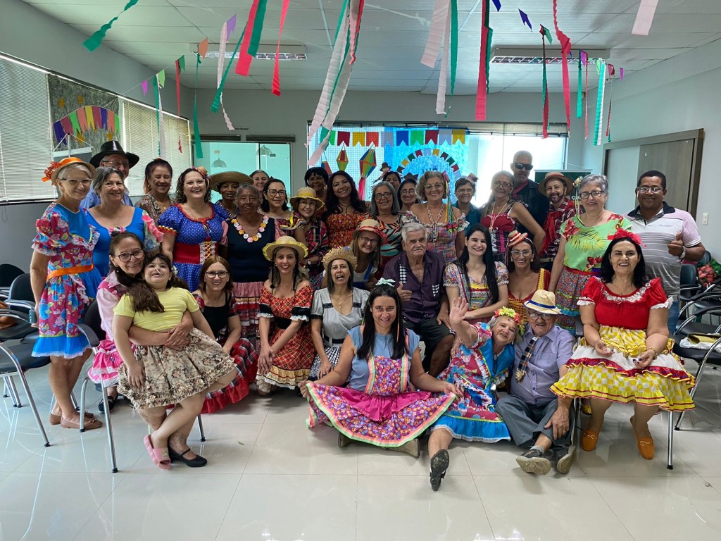 Servidores aposentados deram as boas-vindas com muito entusiasmo a esse mês festivo de comemorações das festas caipiras na manhã desta quinta-feira (01). Os integrantes do grupo de Pós-Aposentadoria “Sorrisos não Envelhecem”, fizeram questão de organizar o encontro e o auditório foi decorado com painéis coloridos, caixotes, retalhos e toalhas xadrez. Além disso, guloseimas como bolo de fubá, paçoca, pipoca, quentão, canjica, foram alguns dos pratos típicos trazidos pelos participantes para partilhar na confraternização.