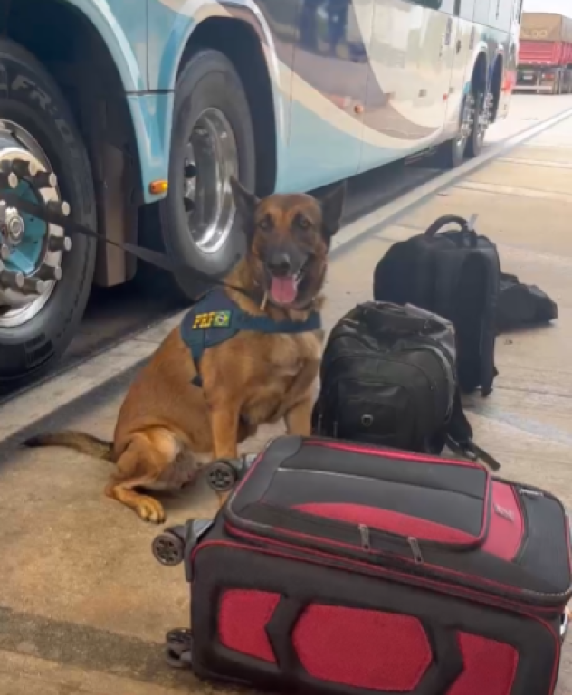 A equipe procedeu com verificações nos compartimentos de bagagem, utilizando os cães K9 Xica e Ector, que sinalizaram positivamente para a presença de substâncias entorpecentes em uma das bagagens.