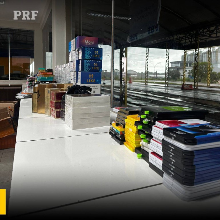 A equipe realizou, então, uma busca na cabine do veículo, onde foram encontradas cinco caixas lacradas. O condutor afirmou que o conteúdo era composto por acessórios de celular, coletados em Guarulhos/SP com destino a Ariquemes/RO, e que a carga não possuía nota fiscal. Diante da declaração, procedeu-se à abertura das caixas, sendo identificados os seguintes itens: