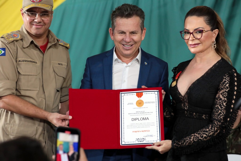 A noite desta quinta-feira (04.05) foi de celebração e homenagem no ginásio da Escola Estadual Militar Dom Pedro II. Convidada pelo comandante-geral BM, coronel Alessandro Borges Ferreira, a primeira-dama do Estado, Virginia Mendes, madrinha dos projetos sociais do Corpo de Bombeiros Militar de Mato Grosso (CBMMT), acompanhada do governador Mauro Mendes, foi condecorada com a medalha ‘Mérito Musical’ pela contribuição a corporação. Durante a cerimônia foram apresentadas às autoridades os projetos Bombeiro do Futuro, Musicalizar e Karabom. O governador Mauro Mendes participou da cerimônia.