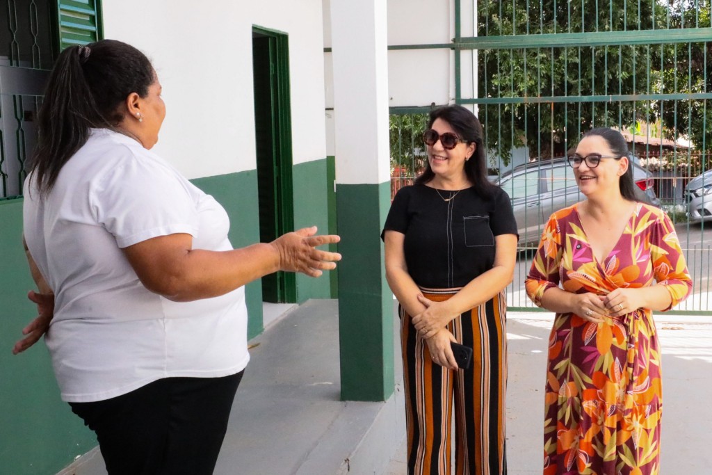 A foto mostra três mulheres, entre elas a primeira-dama de Cuiabá, Samantha Iris. Ela veste um vestido com estampas geométricas em tons de laranja, amarelo e rosa e segura um caderno de anotações. Ao fundo, há um portão verde de grades e algumas árvores.