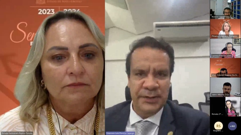#ParaTodosVerem – Esta matéria possui recursos de texto alternativo para promover a inclusão das pessoas com deficiência visual. Primeira imagem: print de tela do Plantão Tira-Dúvidas em destaque a diretora do Dapi, Renata Bueno e o juiz auxiliar, Emerson Cajango.