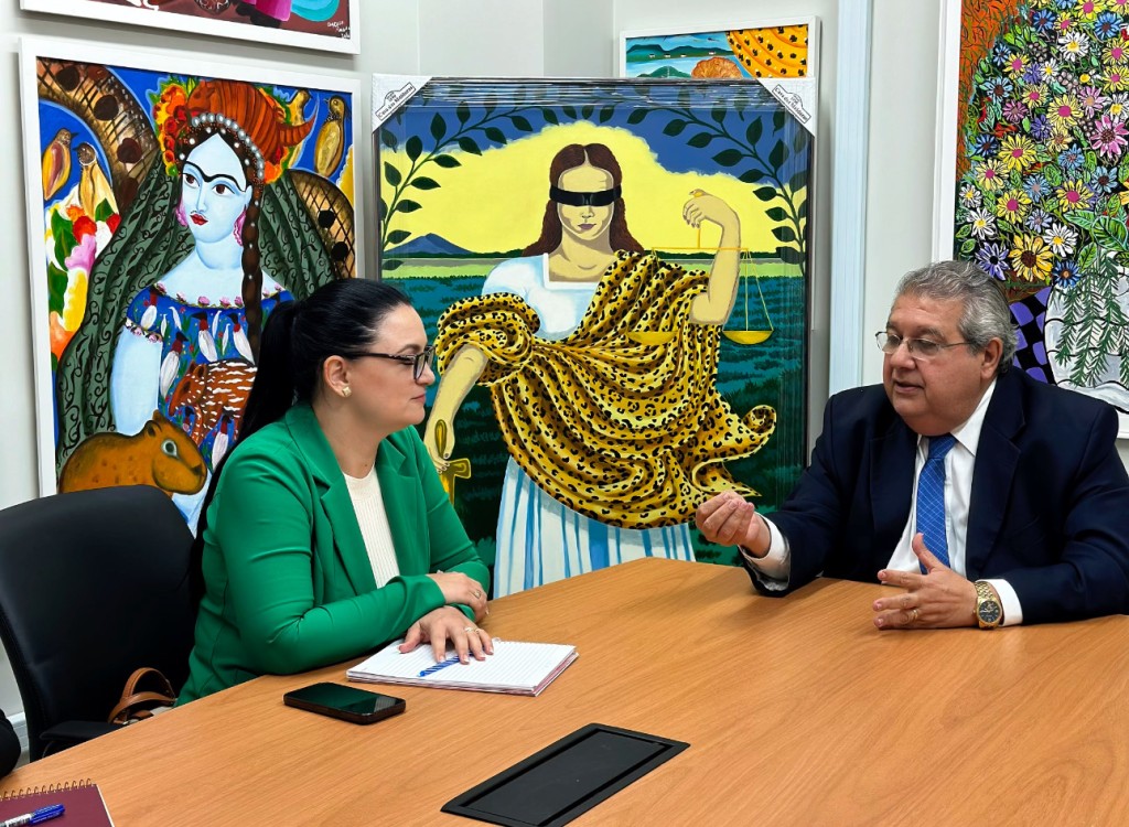 A imagem mostra uma sala da justiça, sendo o gabinete do procurador da justiça, Paulo Roberto Jorge do Prado, onde ele está reunido com a vereadora e primeira-dama de Cuiabá, Samantha íris. O cenário, ao fundo, é composto por elementos que demonstram o poder judiciário.