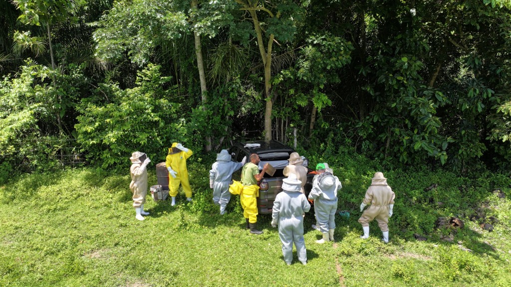 A foto mostra um grupo de pessoas vestindo trajes de apicultor (macacões de proteção claros e amarelos, com chapéus e véus de tela) reunidas em um gramado verde, próximo a uma área de mata densa. Elas estão ao redor de um veículo utilitário preto, que está parcialmente encoberto pela vegetação. Algumas pessoas estão manipulando caixas ou equipamentos relacionados à apicultura. O cenário é ao ar livre, em um dia claro, com árvores altas ao fundo criando uma borda natural. A atividade parece ser uma inspeção ou transporte de colmeias, sugerido pelo uso de roupas de proteção.
