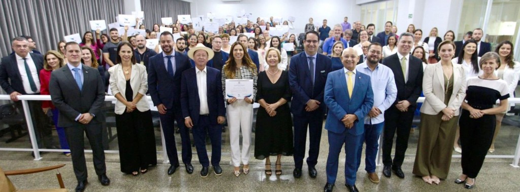 #Paratodosverem – Esta matéria possui recursos de texto alternativo para promover a inclusão das pessoas com deficiência visual. Foto 1: Imagem panorâmica do auditório mostra todos os participantes do evento em pé, olhando para a câmara e sorrindo. Os facilitadores mostram seus certificados. Na primeira fila estão as autoridades que compuseram a mesa de honra e entregaram os certificados. Foto 2: A imagem mostra a presidente do TJMT sorrindo ao entregar um certificado a uma professora, que também sorri.