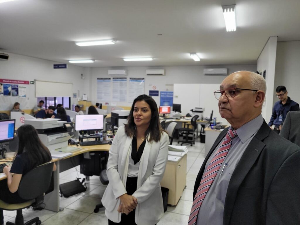 #Paratodosverem Esta matéria possui recursos de texto alternativo para inclusão das pessoas com deficiência visual. Descrição da imagem: Imagem única: foto horizontal colorida. O corregedor está atento às explicações da cartorária de Sorriso. Ao fundo várias pessoas continuam trabalhando.
