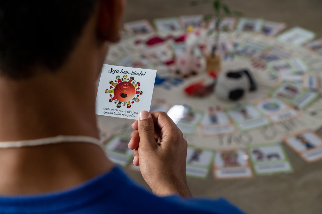 #Paratodosverem. Esta matéria possui recursos de texto alternativo para promover a inclusão das pessoas com deficiência visual. Primeira imagem: Foto de um jovem de costas com a sua nuca em primeiro plano. Ele segura uma figura na mão direita com a imagem de várias crianças em formato circular de mãos dadas. Na figura está escrito ‘Seja bem-vindo! Nenhum de nós é tão bom quanto todos nós juntos!’. Em segunda, a imagem de diversos desenhos dispostos em circulo no chão. Segunda imagem: Diversas pessoas sentadas em círculo. Na imagem não é possível identificar o rosto dos participantes. No chão diversas palavras de encorajamento estão dispostas no chão em formato circular.