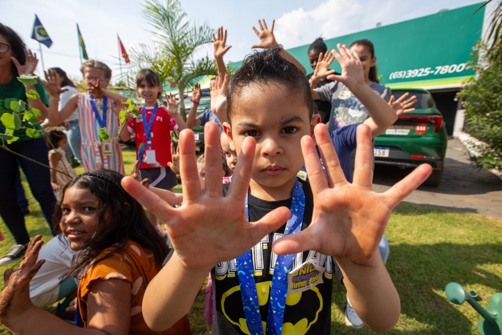 #Paratodosverem. Esta matéria possui recursos de texto alternativo para promover a inclusão das pessoas com deficiência visual. Primeira imagem: fotografia colorida mostrando uma criança com as mãos esplamadas. Ao fundo outas crianças repetem o gesto. Segunda imagem: fotografia colorida registrando as crianças sentadas e assistido a uma apresentação, com projeção de slaides em um telão. Terceira imagem: fotografia colorida mostra o momento em que um grupo de crianças se aglomera emtorno de uma muda que está sendo plantada.