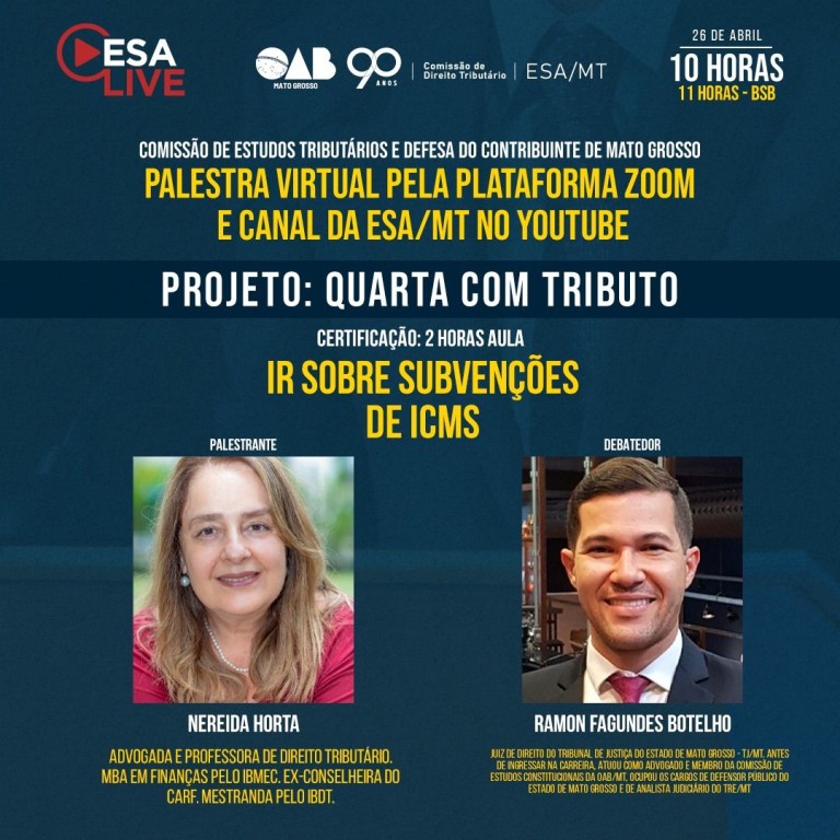Nesta quarta-feira (26 de abril), às 10h (horário de MT), será realizada mais uma edição do projeto “Quarta com Tributo”. Desta vez, o tema será “Imposto de Renda sobre subvenções de ICMS”. O evento conta com o apoio da Escola Superior da Magistratura de Mato Grosso (Esmagis-MT) e é realizado pela Comissão de Estudos Tributários e Defesa do Contribuinte de Mato Grosso e Escola Superior da Advocacia (ESA).