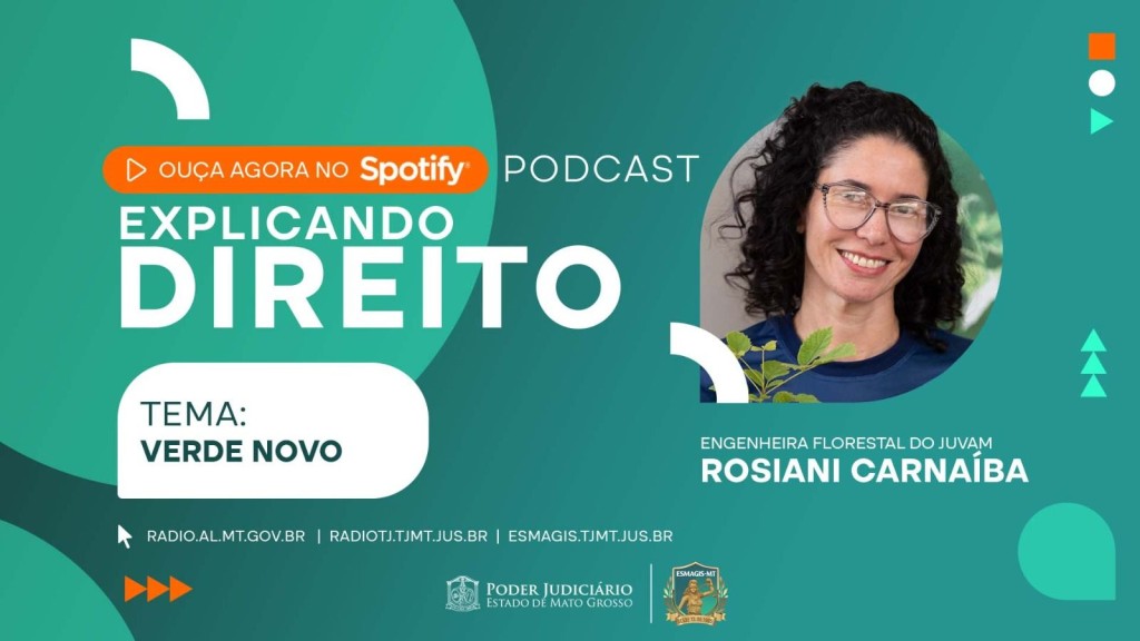 Esta matéria possui recursos de texto alternativo para promover a inclusão das pessoas com deficiência visual. Descrição: Fotografia retangular e colorida. Na lateral esquerda o texto ‘Ouça agora no Spotify!’. No canto superior direito a palavra Podcast. No centro, o nome do programa Explicando Direito, com a foto do convidado, o tema do programa – Projeto Verde Novo – e o nome do convidado – Rosiani Carnaíba. Na parte inferior os endereços eletrônicos da Rádio Assembleia, Rádio TJ e Escola da Magistratura. Assina a peça o logo do Poder Judiciário de Mato Grosso e da Esmagis-MT.